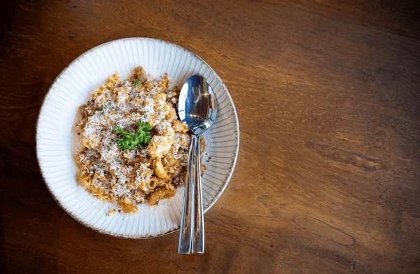 • Espagueti casero a la boloñesa, tomate seco, albahaca y mahonesa de hoisin.
