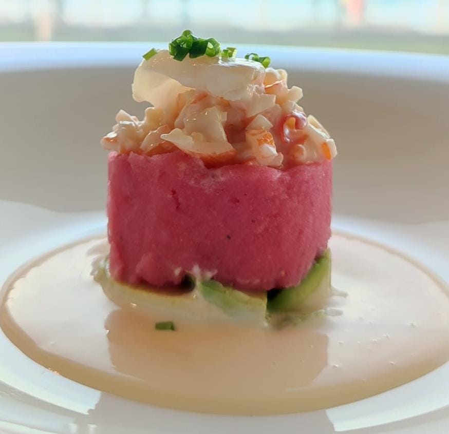- Ceviche de atún con leche de tigre de rocoto y pomelo, sobre palmitos y crujiente de calabazas.